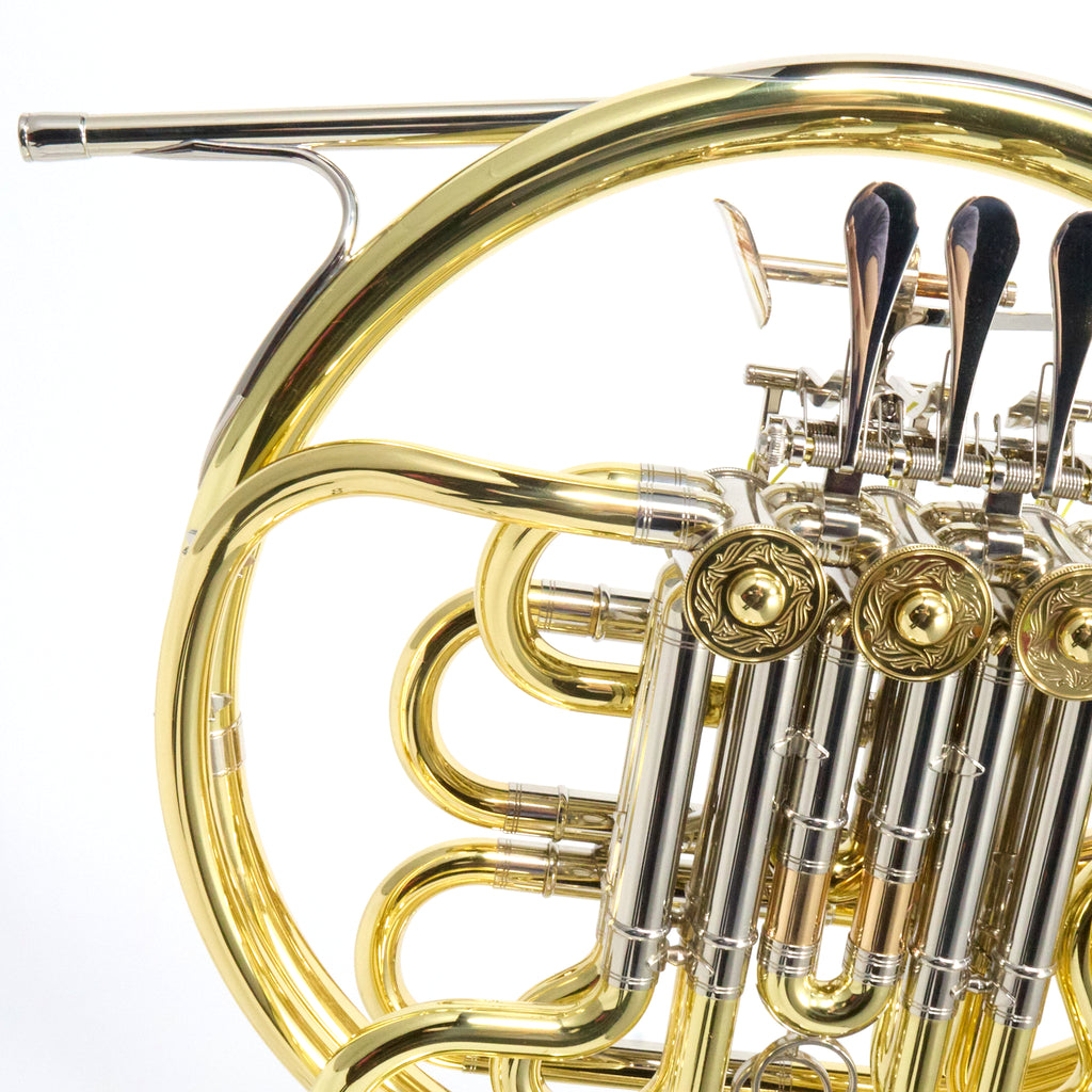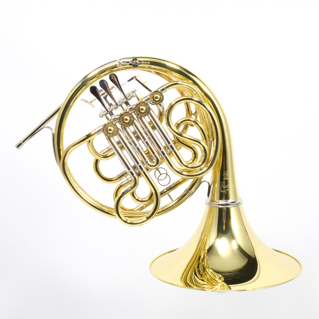 This YHR-871D professional French horn with dual plane valves has been very lightly used as a demo horn and is in excellent condition. This is Yamaha's custom Geyer wrap instrument. The Geyer wrap horns have been gaining popularity for years now and are starting to become the standard for orchestral playing. Construction is solid yellow brass for a sound that is full and symphonic. Detachable bell makes storage a snap!