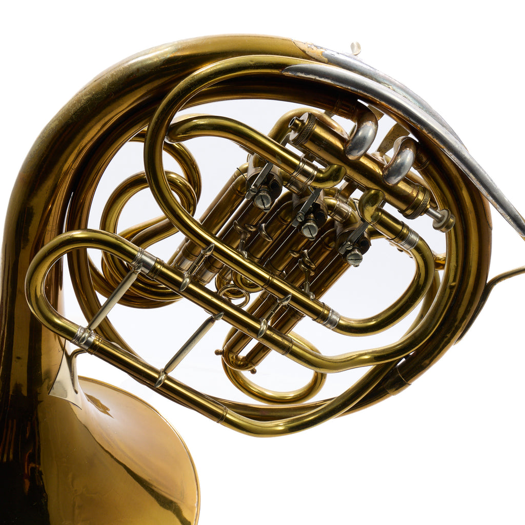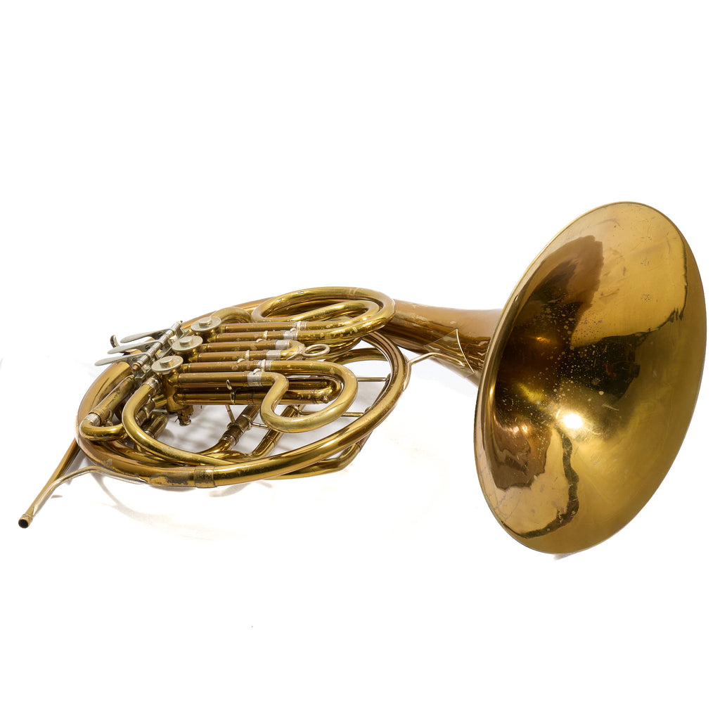 This one is in excellent condition. It is a 4 valve double in F/Bb, and is suited for soloistic or orchestral playing. Stands in F, piston change to Bb. Valves are excellent, tight, and have just been shop adjusted. This instrument has had an overhaul and relacquer at some point. This horn plays very well! Includes case, but no mouthpiece with this one.