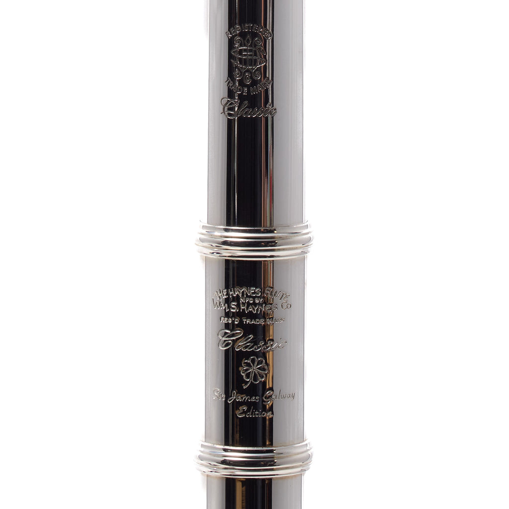 The William S. Haynes 'James Galway' is a Q Series professional concert flute that pairs a solid-silver Haynes headjoint with a sterling-silver body and silver-plated mechanism. The Haynes Classic headjoint emphasizes control, color changes, and a quick, centered response across registers. The drawn tone holes and Modern Haynes scale contribute to a focused core with consistent intonation, while the open-hole (French) keywork and B foot provide the range and flexibility expected in professional repertoire.