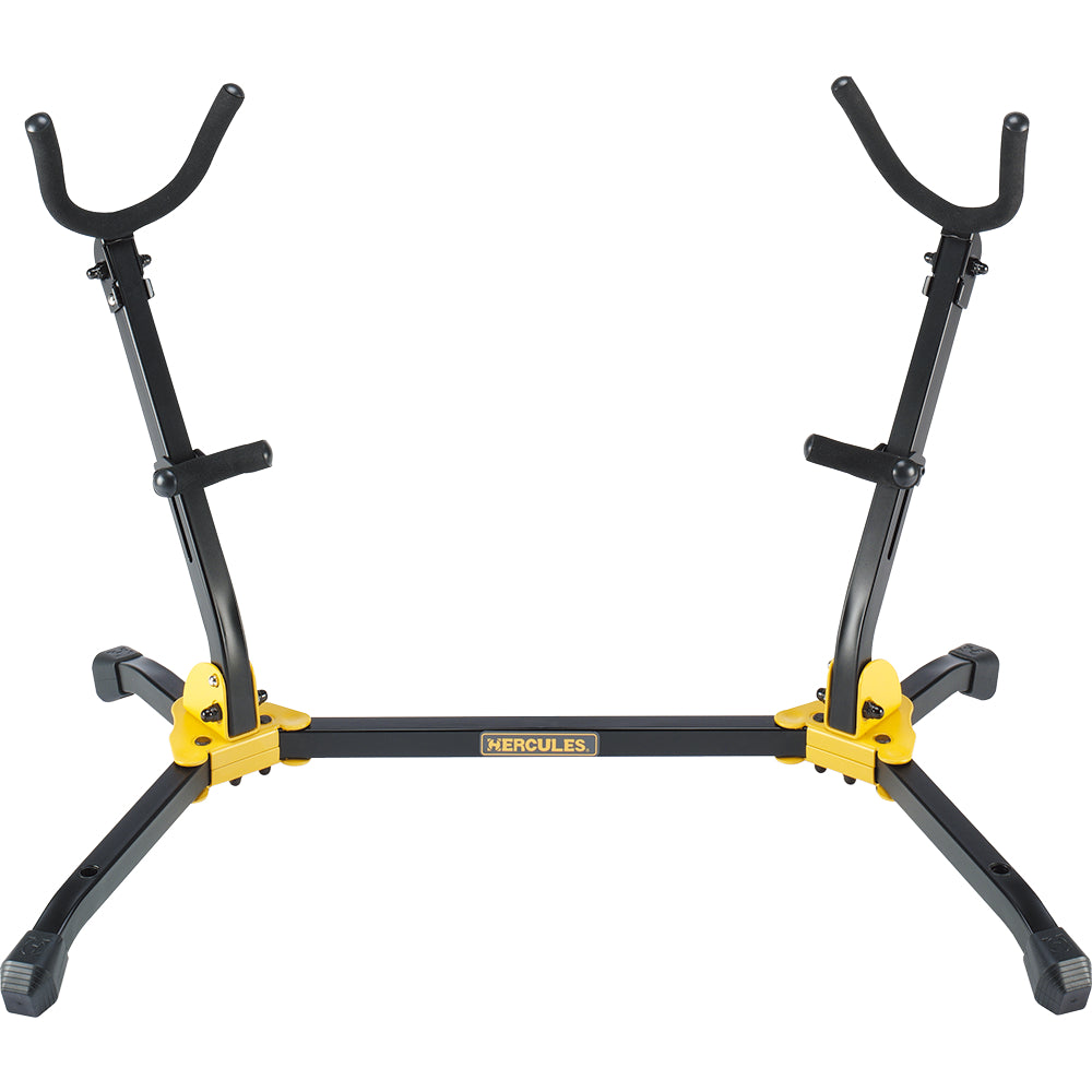 The HERCULES Double Saxophone Stand DS537B features the one-piece folding design with locking pins and can support up to 44 pounds total instrument weight.