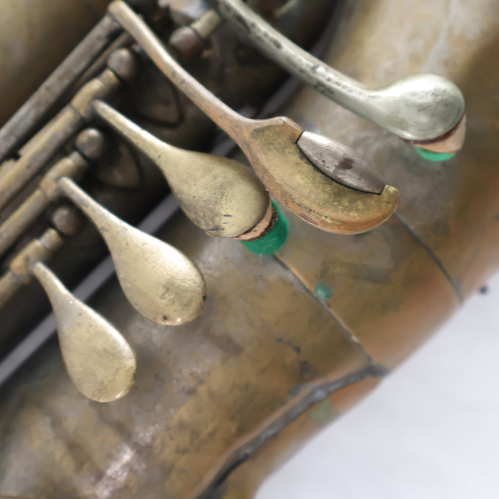 As expected for an artifact of its age, this contrabass ad anchia exhibits wear consistent with its historical journey. This instrument is not guaranteed to be playable and is offered as a historical artifact only. However, it is completely intact and completely restorable, though it will need all new pads and the attention of a good tech. It is an invaluable collector's piece suitable for academic study or display in museums and educational institutions interested in the evolution of woodwind instruments.
