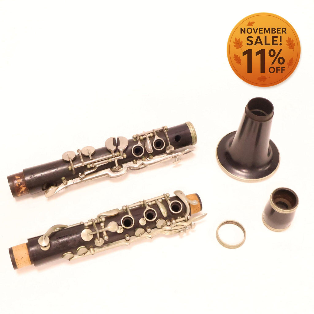 This clarinet is in overall good condition and has all of its components, but it will need an overhaul to be playable. As this instrument is historically interesting, we have chosen to not do restoration work on it and leave that to the eventual owner. Instrument will need both pad and keywork to be playable.