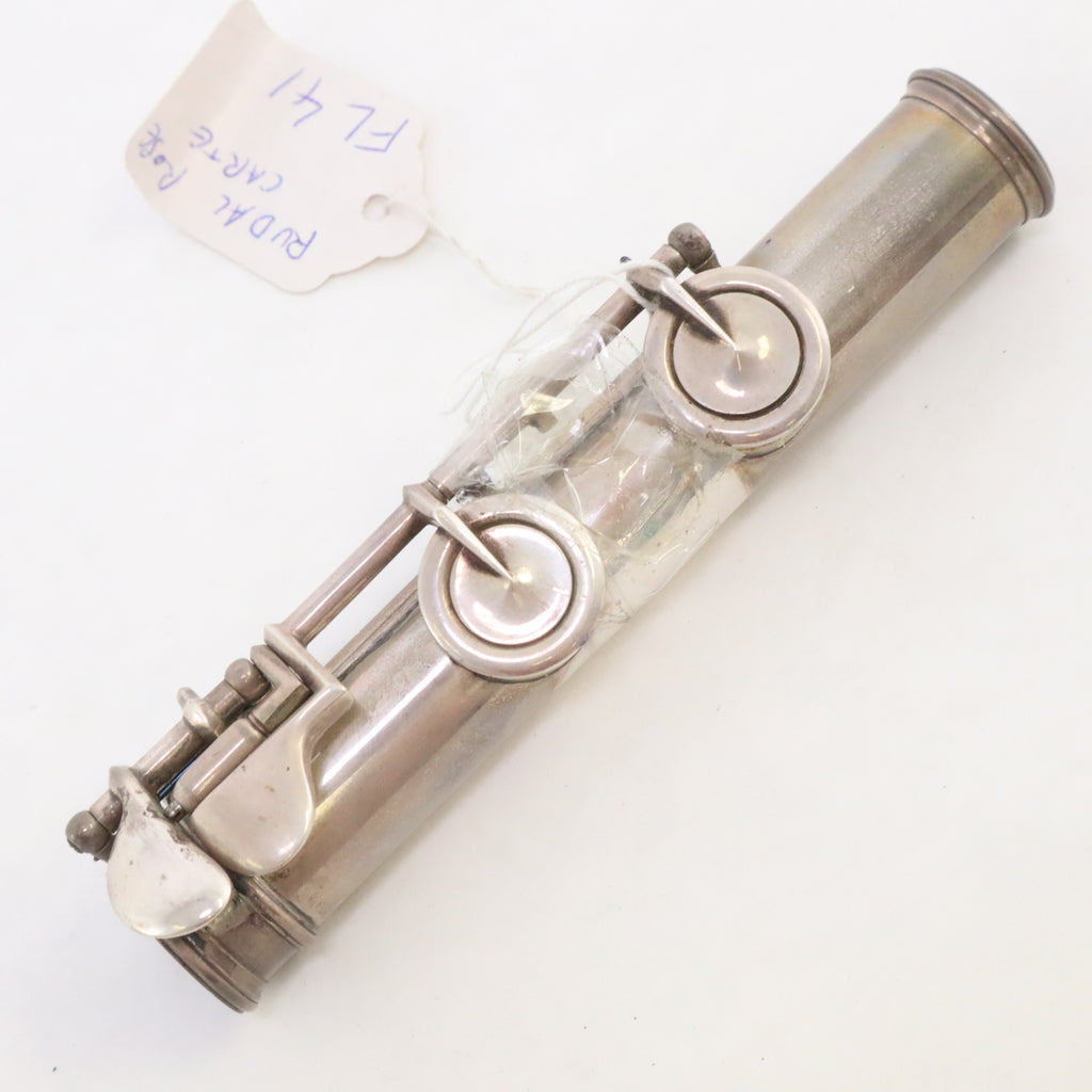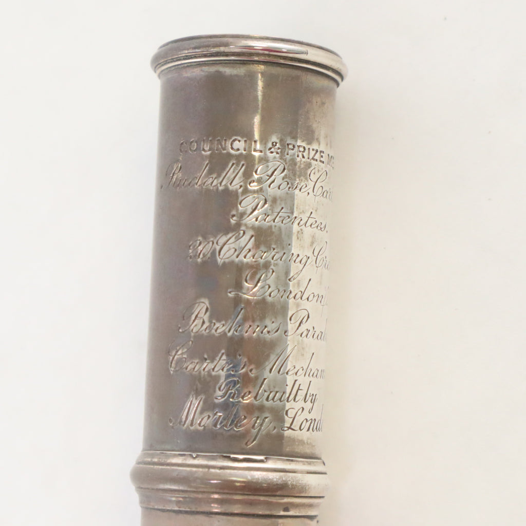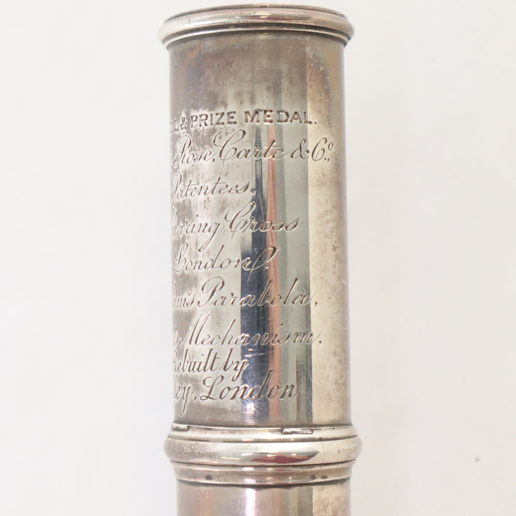 Tube and headjoint are solid silver, and the holes are soldered. Inscription reads: Rudall, Rose, Carte, and Co, Patentees, 30 Charing Cross, London, Boehm's Parabola, Carte's Mechanism, Rebuilt by Morley, London. This flute will need a full rebuild to be playable.
