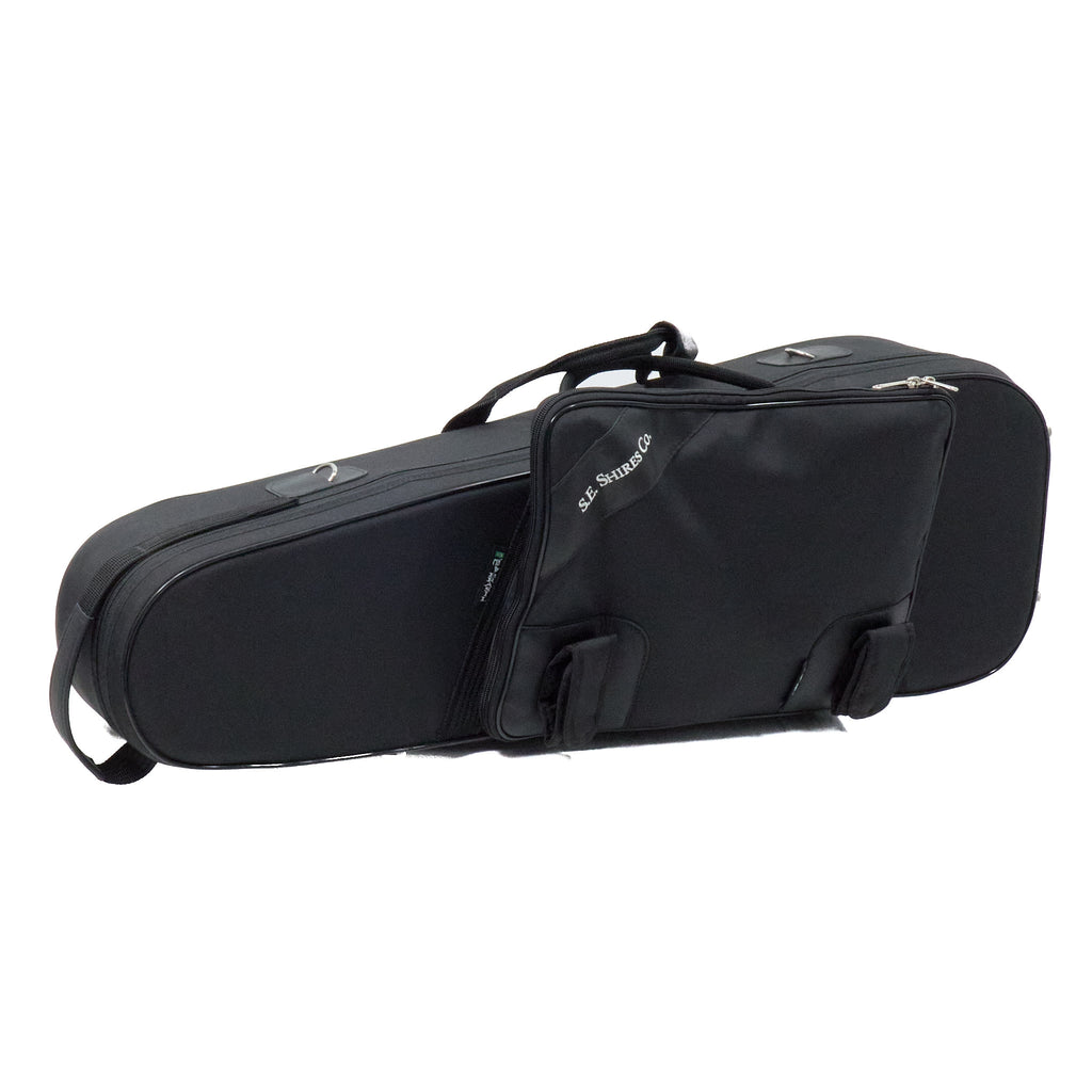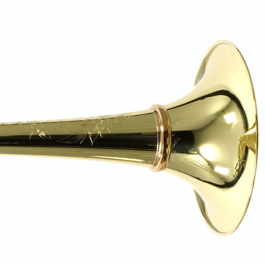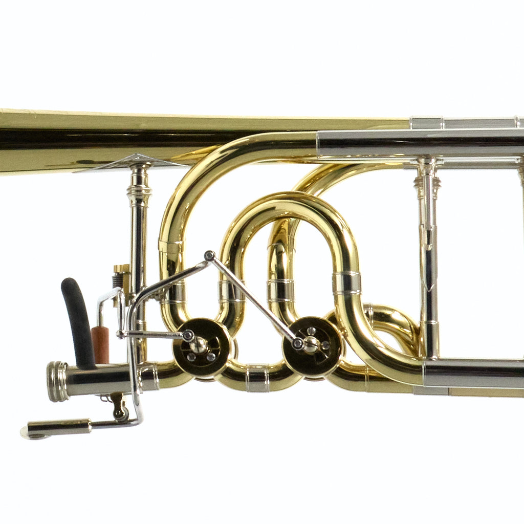 This S.E. Shires Custom bass trombone is a versatile instrument with a clear, pure sound and the consistency, playability, and projection that has made S.E. Shires trombones the favorites of professionals the world over. The unique S.E. Shires BII 7 bell combines the quick response and color of a one-piece bell with the centered feel and expansive tone of a two-piece bell. The BII taper in medium-weight yellow brass produces a clear, rich sound that is very balanced and flexible throughout the range of dynamics and the additional mass of the detachable bell tone ring helps center the tone and keep it from breaking up in loud passages. The traditional rotary valves feel very centered and even and allow for a truly accurate low register. This instrument is paired with a Blair Bollinger model handslide and tuning slide that provide an enormous tone that emulates Mr. Bollinger's Philadelphia sound.