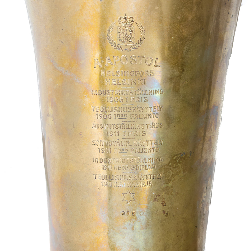 Here's a nice Apostal Kaiser baritone, or circular baritone in raw brass. Not a Wagner tuba but an incredible simulation! These instruments are popular in Germany and Austria, and this is the style of instrument that Mahler wrote the famous solo in his 7th symphony for. Most of these instruments were made in that same area, but this one is a bit unusual having been made in Helsinki, Finland.