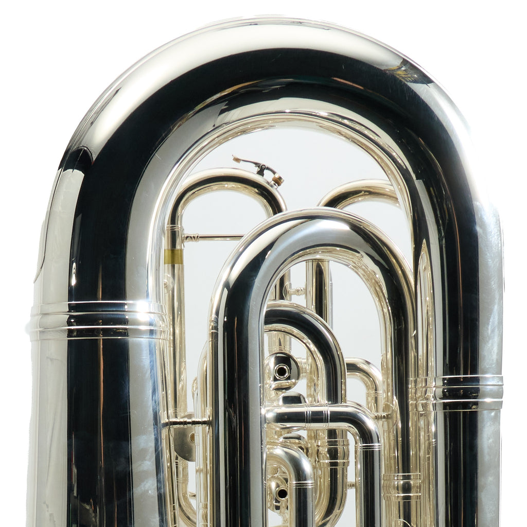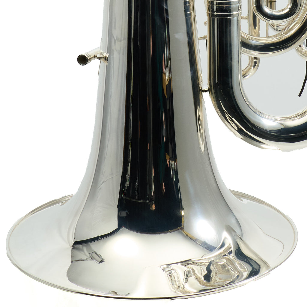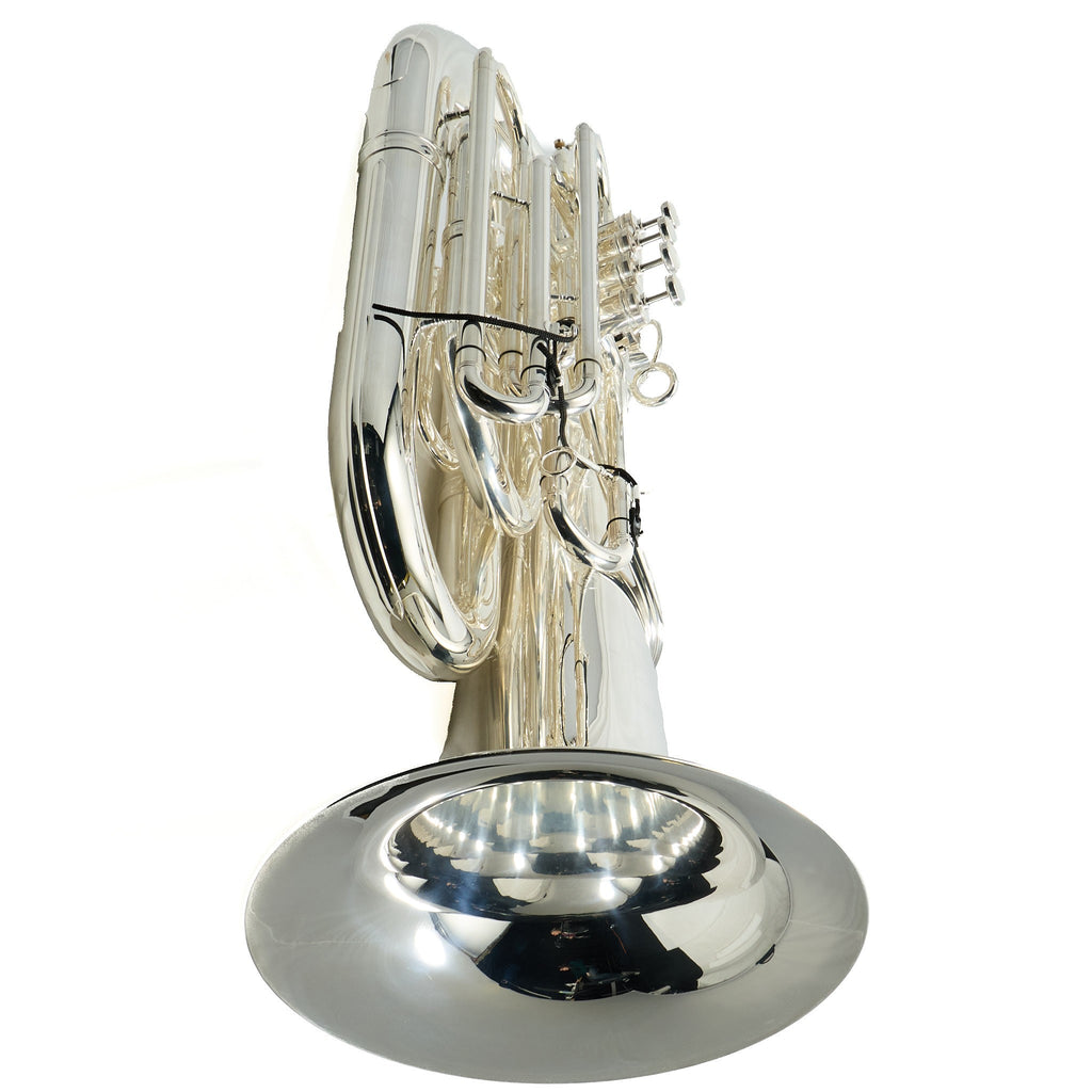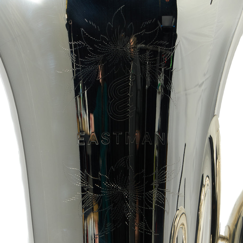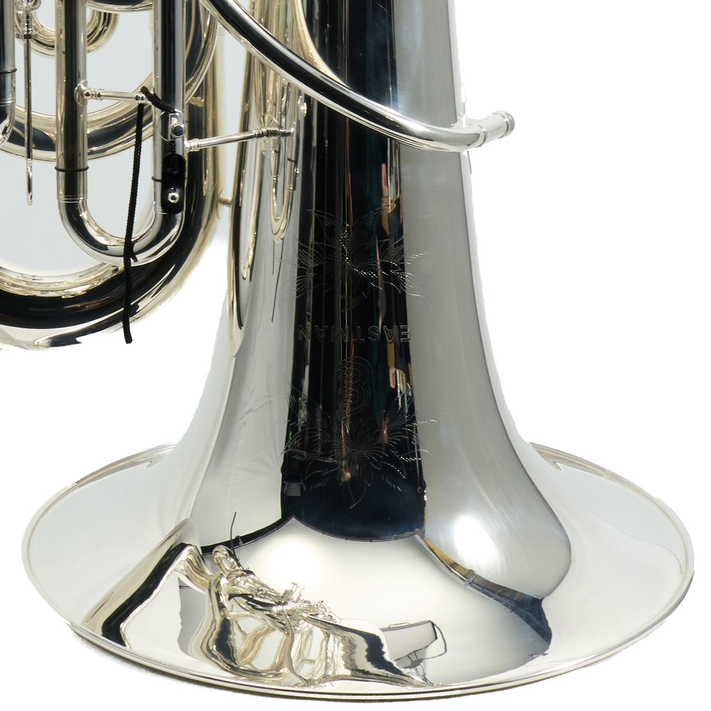The Eastman EBC834S is a professional 5/4 size CC tuba built for orchestral, wind ensemble, and solo playing where a broad, centered sound and secure low register are required. It features a .748 inch to .787 inch bore profile, a 19 inch upright yellow brass bell, four front-action pistons, and a fifth rotary valve for extended low-range facility and alternate fingerings. This listing includes a Laskey 30H US mouthpiece, a deluxe wheeled case, and a silver plate finish.