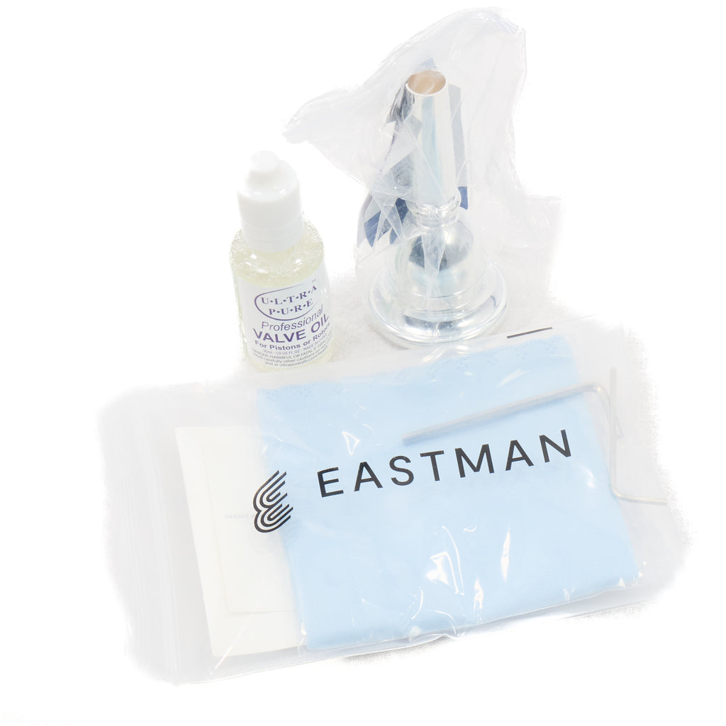 - Accessories include: Laskey 28H mouthpiece, valve oil, polish cloth