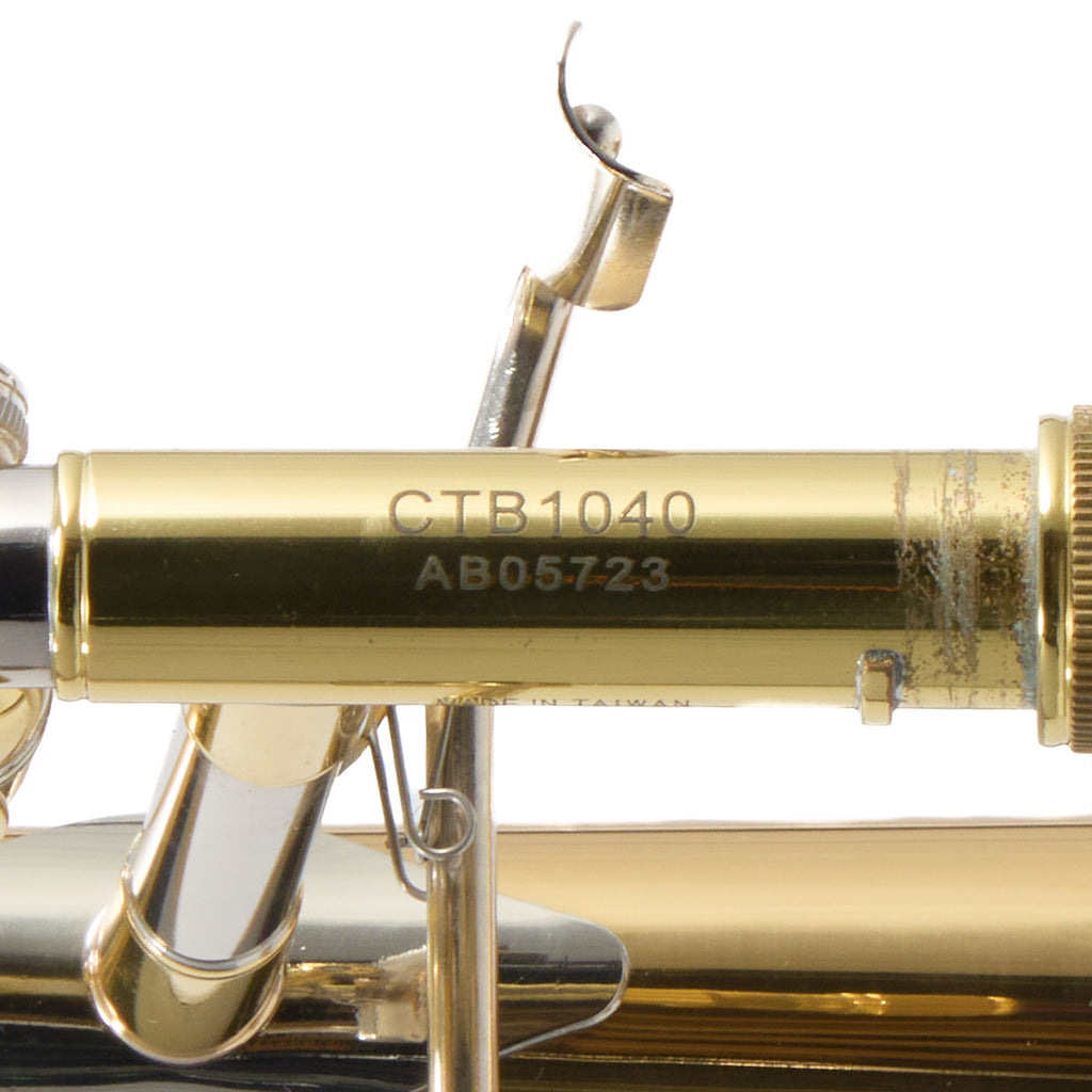 Here's a superb Jupiter CTB1040Q CXL series intermediate trombone with F-attachment. This instrument represents an older model of Jupiter that is no longer being made, but it shares many characteristics with the current model 1236LO. This instrument sports a .547 bore, rose brass bell, and F-attachment; it is an ideal instrument for the budding trombone player's first F-attachment horn.