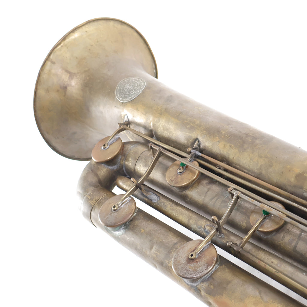 As expected for an artifact of its age, this contrabass ad anchia exhibits wear consistent with its historical journey. This instrument is not guaranteed to be playable and is offered as a historical artifact only. However, it is completely intact and completely restorable, though it will need all new pads and the attention of a good tech. It is an invaluable collector's piece suitable for academic study or display in museums and educational institutions interested in the evolution of woodwind instruments.