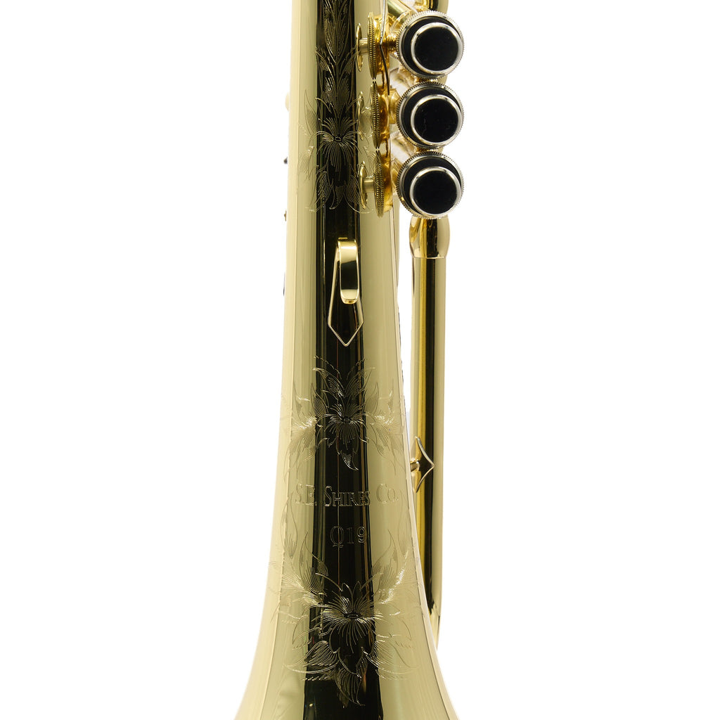 The S.E. Shires Q19 is a professional flugelhorn built around a handspun 6 inch yellow brass bell with a traditionally brazed seam and soldered bead, paired with a .437 inch bore and a yellow brass leadpipe bit with a large Morse taper. It features a three-piston valve cluster with nickel-silver outer tubes, hand-lapped Monel pistons, and an ergonomically designed third-slide trigger for practical intonation control. Finished in lacquer and supplied with a case, mouthpiece, and maintenance kit, the Q19 is designed for players who need a warm flugelhorn voice with consistent response in ensemble and solo settings.