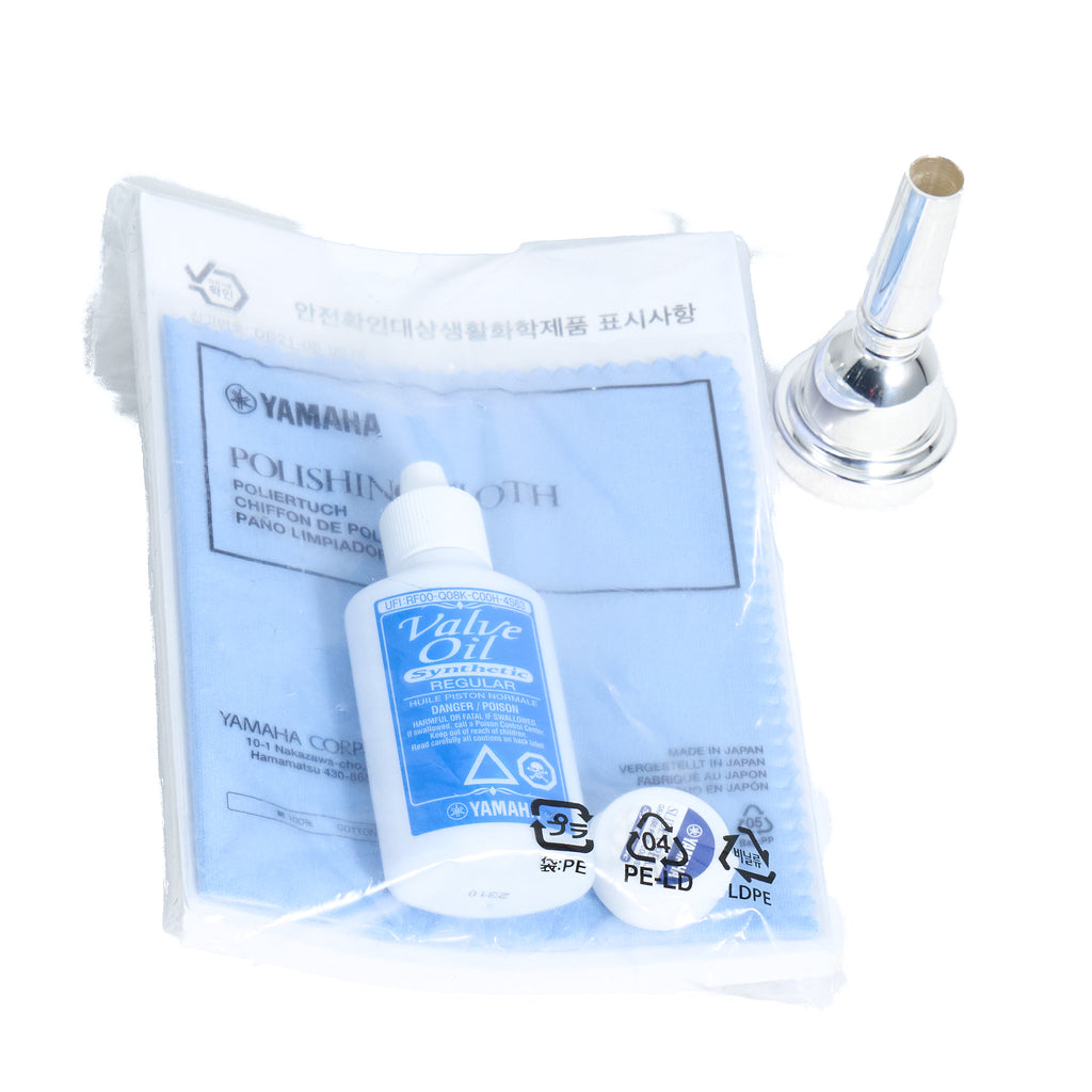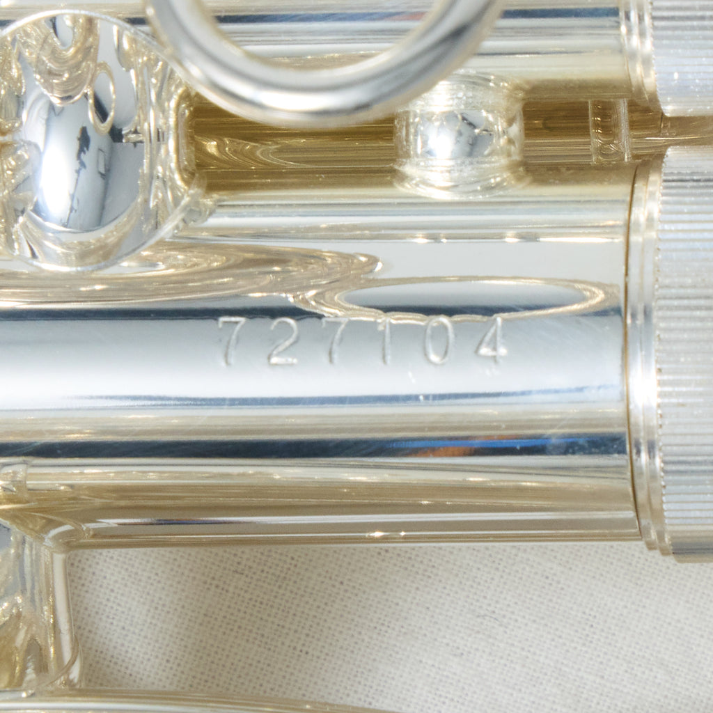 This particular one is in mint condition. The silver is perfect, being 100% present with no wear. There are no dings or dents. Valves are also perfect and this horn plays great! This instrument was a demo horn and doesn't appear to have received much use. Freshly serviced in our shop and ready to play! Comes complete with original case and all original accessories, including polish cloth, valve oil, and Yamaha 51L mouthpiece.