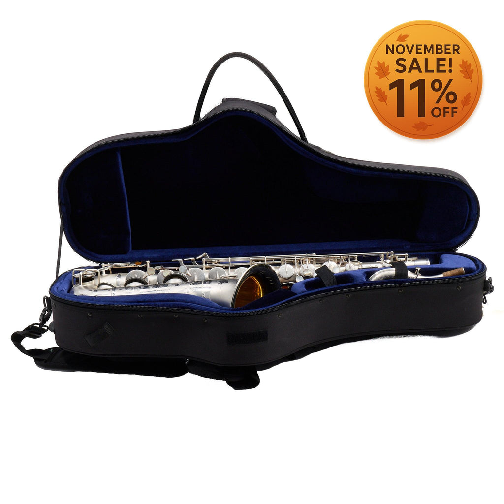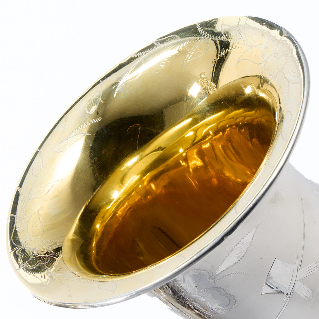 This horn is in amazing condition. The body is excellent. This saxophone has been meticulously refinished in satin silver with bright silver highlights and gold wash in the bell. We aren't sure who did this job, but they certainly did some amazing work, and this instrument is just gorgeous. Freshly serviced in our shop and ready to play! Includes case, but no mouthpiece with this one.