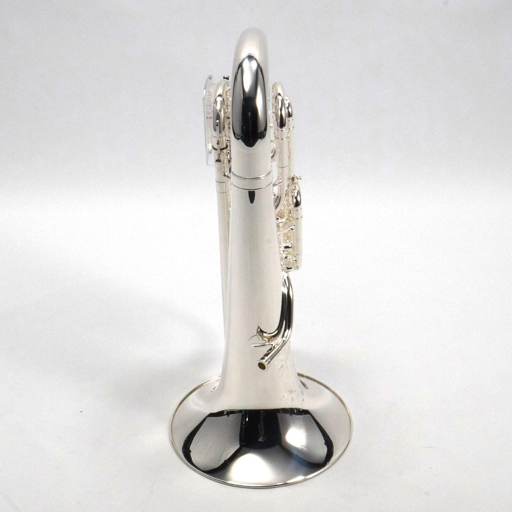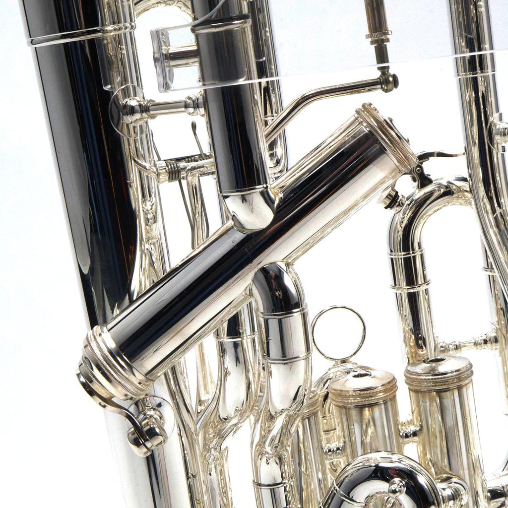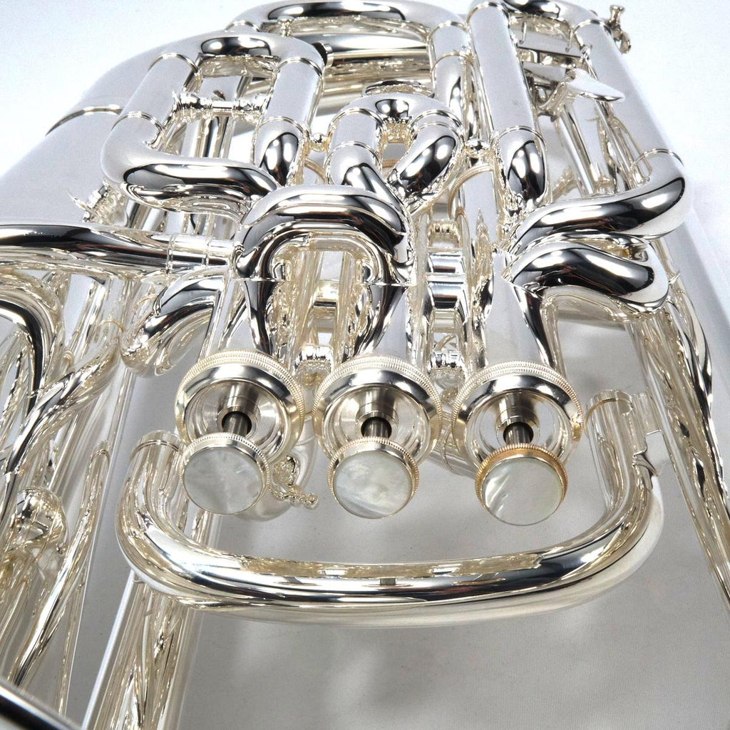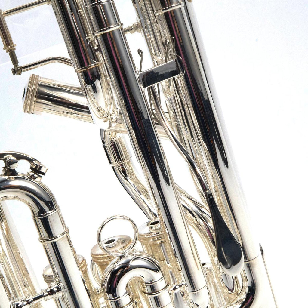 The S.E. Shires SEUSOLOT-S Solo is a silver-plated, compensating Bb/F euphonium built in Shires’ Massachusetts workshop, featuring a main tuning slide trigger, hand-hammered 12 inch yellow brass upright bell, stainless steel pistons, and dual interchangeable (medium and large shank) mouthpiece receivers for flexible setup across repertoire and player preference.