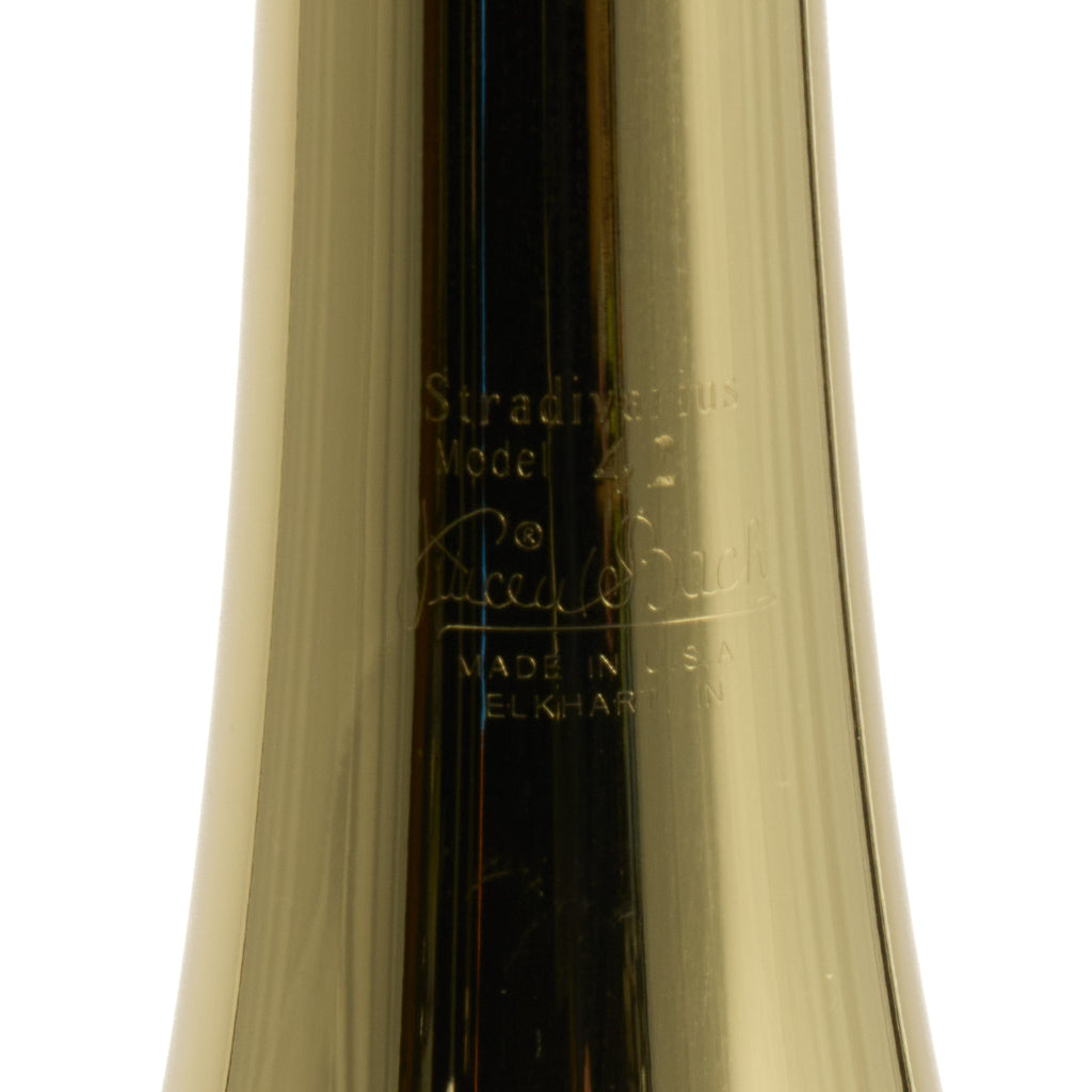 The Bach 42BO trombone features an 8-1/2 inch one-piece hand-hammered yellow brass bell that has defined the symphonic sound for generations. The .547 large bore combined with the traditional wrap F attachment offers outstanding clarity and projection with just the right amount of resistance. The chrome plated nickel silver inner handslide tubes provide the ideal surface for smooth and quick handslide action. The clear lacquer finish adds a subtle warmth to the sound overall. The Bach Stradivarius 42BO professional trombone is ideal for both symphonic and solo performance.