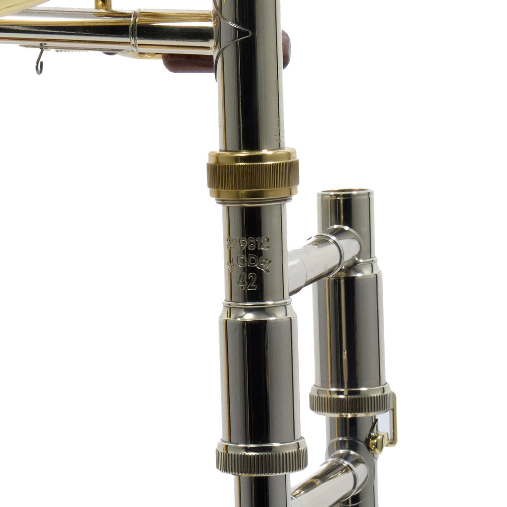 The Bach LT42AG is a fantastic symphonic trombone. It features an 8-1/2 inch, one-piece, hand-hammered yellow brass bell that has defined the symphonic sound for generations. The .547 large bore combined with the open wrap F attachment and Hagmann valve offers outstanding clarity and projection with minimal resistance. The chrome plated nickel silver inner handslide tubes provide the ideal surface for smooth and quick handslide action, and the lightweight nickel-silver slide allows you to rip through those fast passages effortlessly. The gold brass bell adds a subtle warmth to the sound overall. The Bach Stradivarius LT42AG professional trombone is ideal for both symphonic and solo performance.