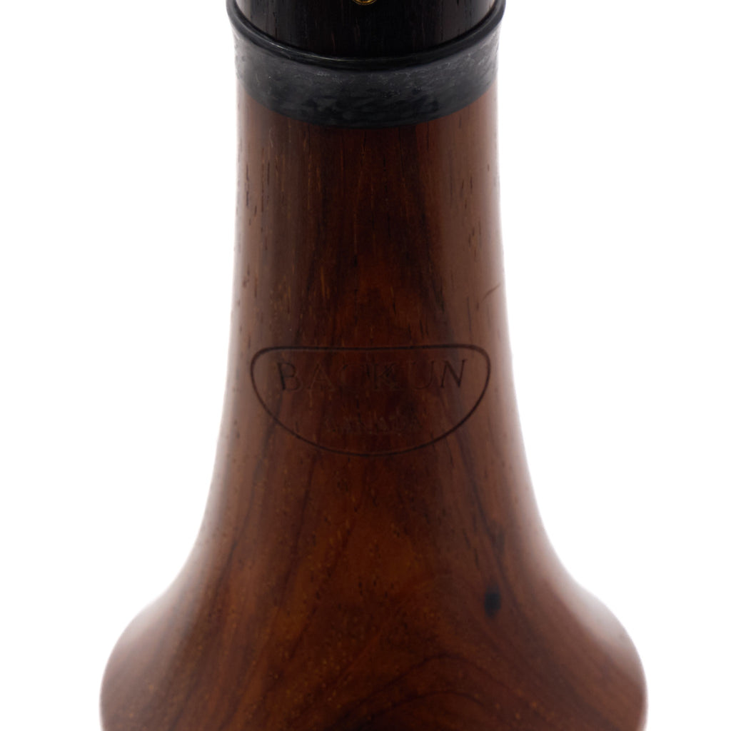 The Backun Basset Lower Joint for A Clarinet is a basset-extension lower joint and bell assembly designed to fit onto the upper joint of an existing A clarinet, converting it into a basset clarinet with extended range down to low C. Built from cocobolo wood, it features silver plated keywork with gold plated posts for a traditional professional appearance and durable hardware pairing.