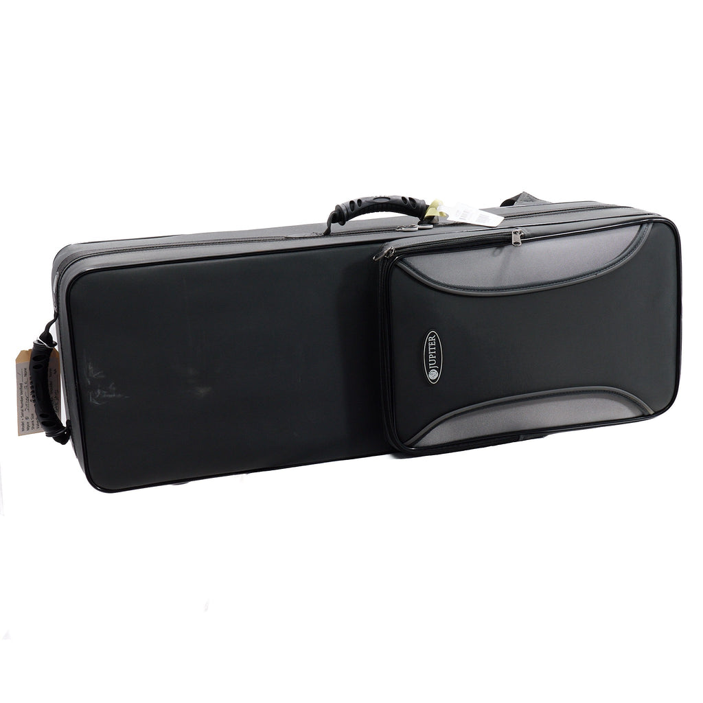 It includes the original Jupiter backpack-style case, valve oil, a polish cloth, and a Jupiter small shank 12C mouthpiece.