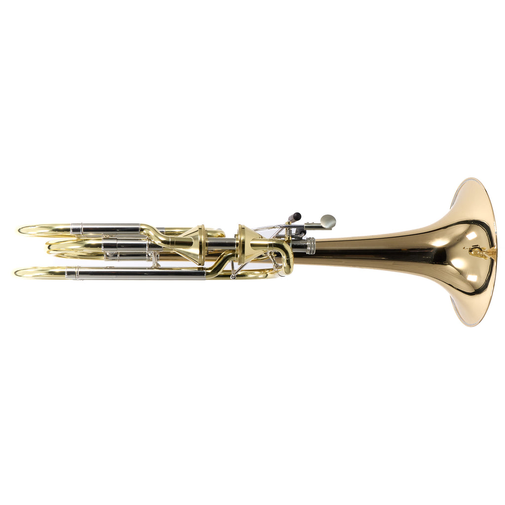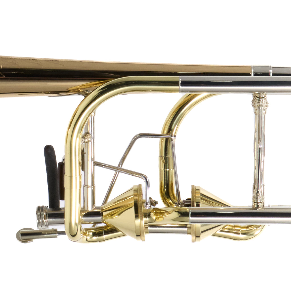 A versatile bass trombone, the Q36GA features the clarity of sound and projection for which S.E. Shires instruments are famed. The QYB bell features an 91/2-inch, two-piece, hand-hammered “QII” taper in gold brass with soldered bead, giving this trombone a warm, singing tone with excellent projection and clarity with a full, deep low register and broad sound. The wide, .562 bore handslide in standard weight yellow brass results in a broad sound that retains clarity, color and projection. The nickel handslide crook gives crispness and brilliance to the articulations. The independent axial flow valves retain focus throughout all registers and provide an incredibly open valve register. This independent valve system allows for more flexibility of choice in valve and slide position choices. At home in any ensemble, the Q36GA bass trombone is an excellent choice for any situation.