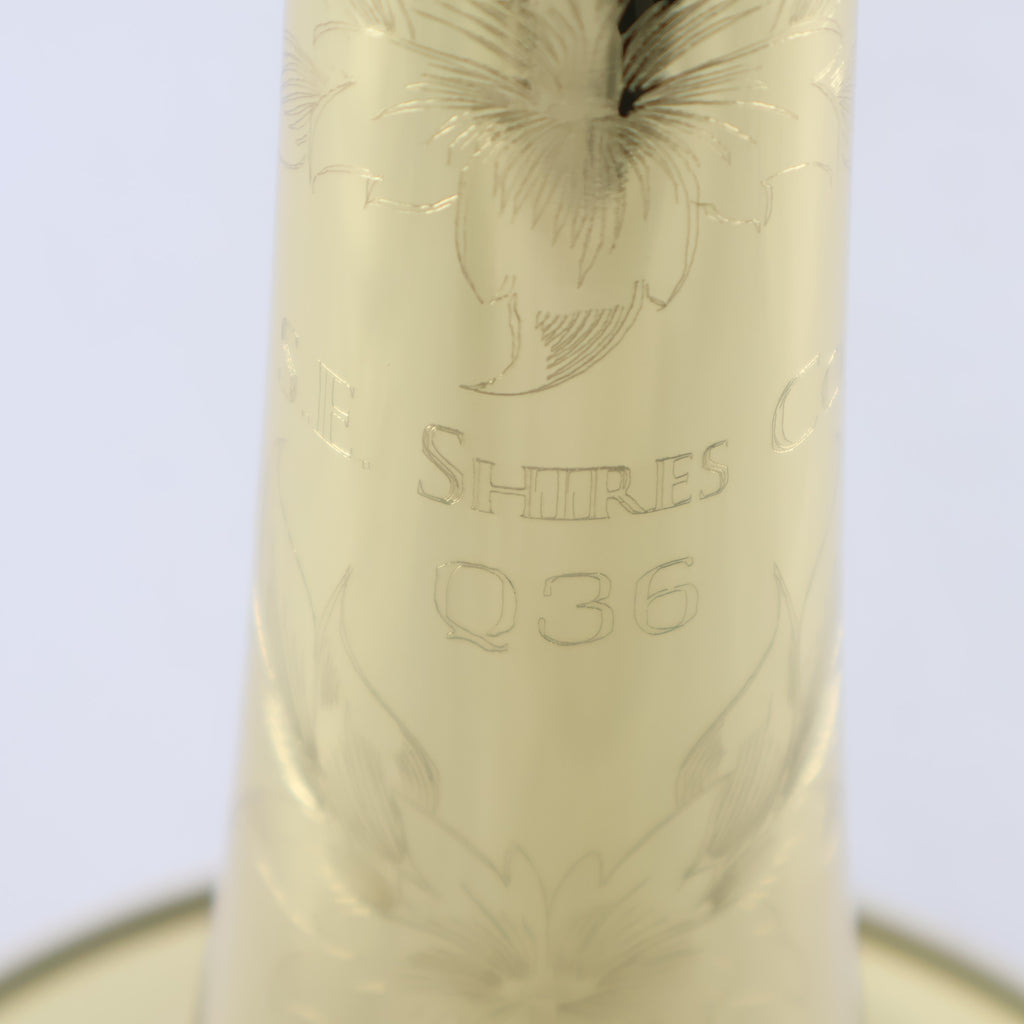 A versatile bass trombone, the Q36YR features the clarity of sound and projection for which S.E. Shires instruments are famed. The QYB bell features an 91/2-inch, two-piece, hand-hammered “QII” taper in yellow brass with soldered bead, giving this trombone a clear, singing tone with excellent projection and clarity with a full, deep low register and broad sound. The wide, .562 bore handslide in standard weight yellow brass results in a broad sound that retains clarity, color and projection. The nickel handslide crook gives crispness and brilliance to the articulations. The independent rotary valves retain focus throughout all registers without sacrificing comfort or clarity in the valve register. This independent valve system allows fore more flexibility of choice in valve and slide position choices. At home in any ensemble, the Q36YR bass trombone is an excellent choice for any situation.